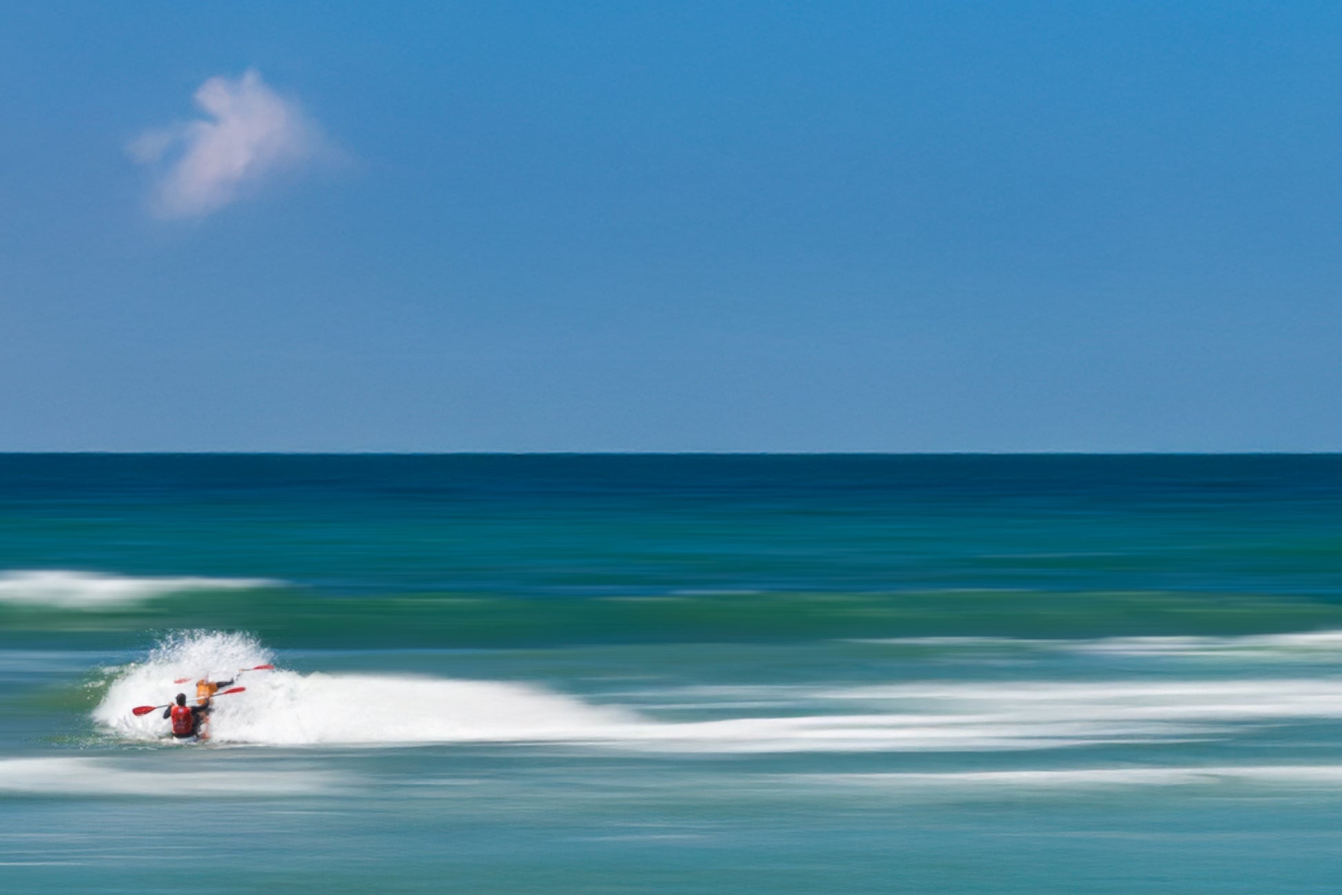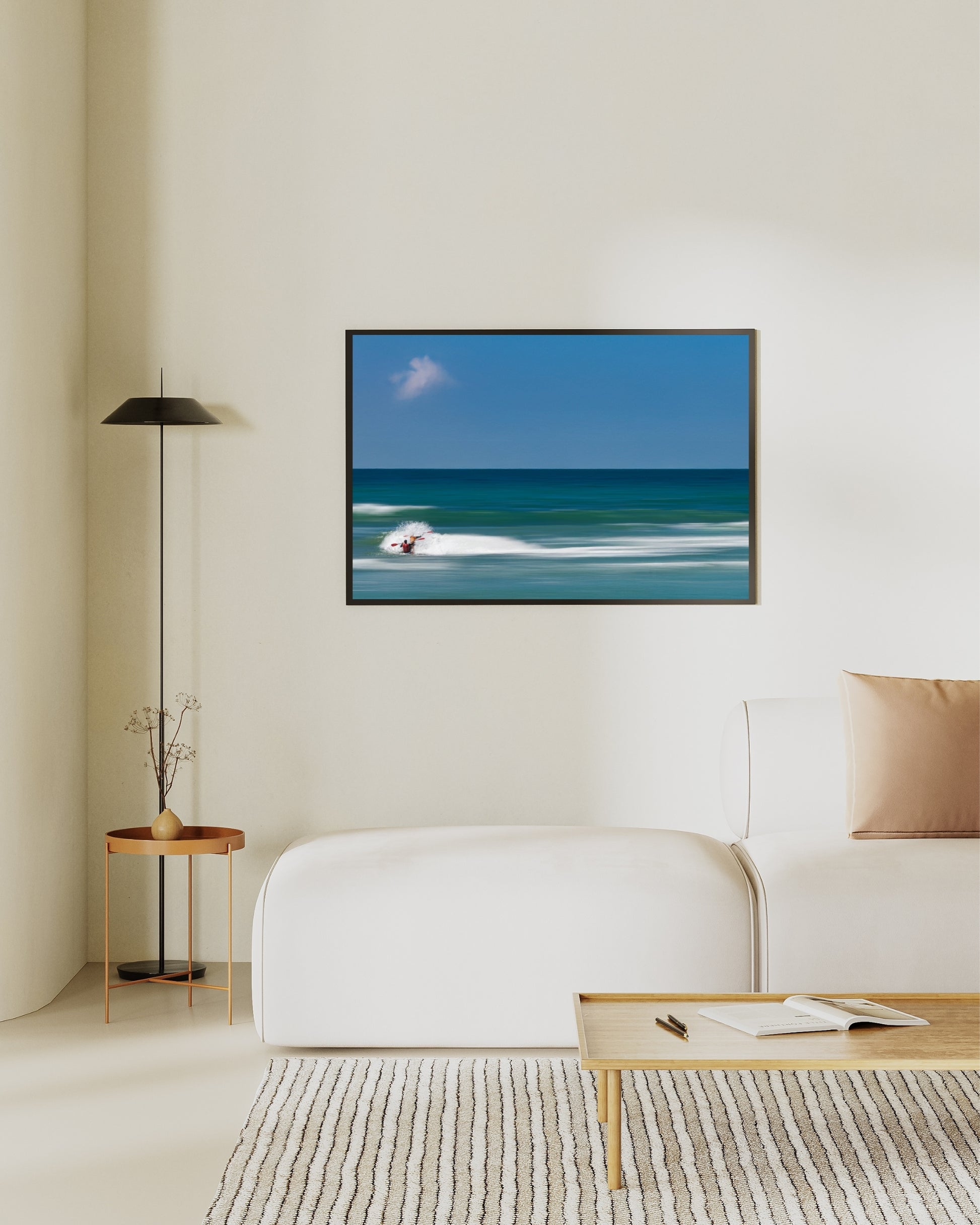 La présence minuscule au cœur de l’image introduit une échelle humaine discrète, presque abstraite, accentuant la sensation d’espace et de liberté. Le mouvement de l’eau contraste avec la stabilité du cadre, créant une tension douce entre vitesse et calme.