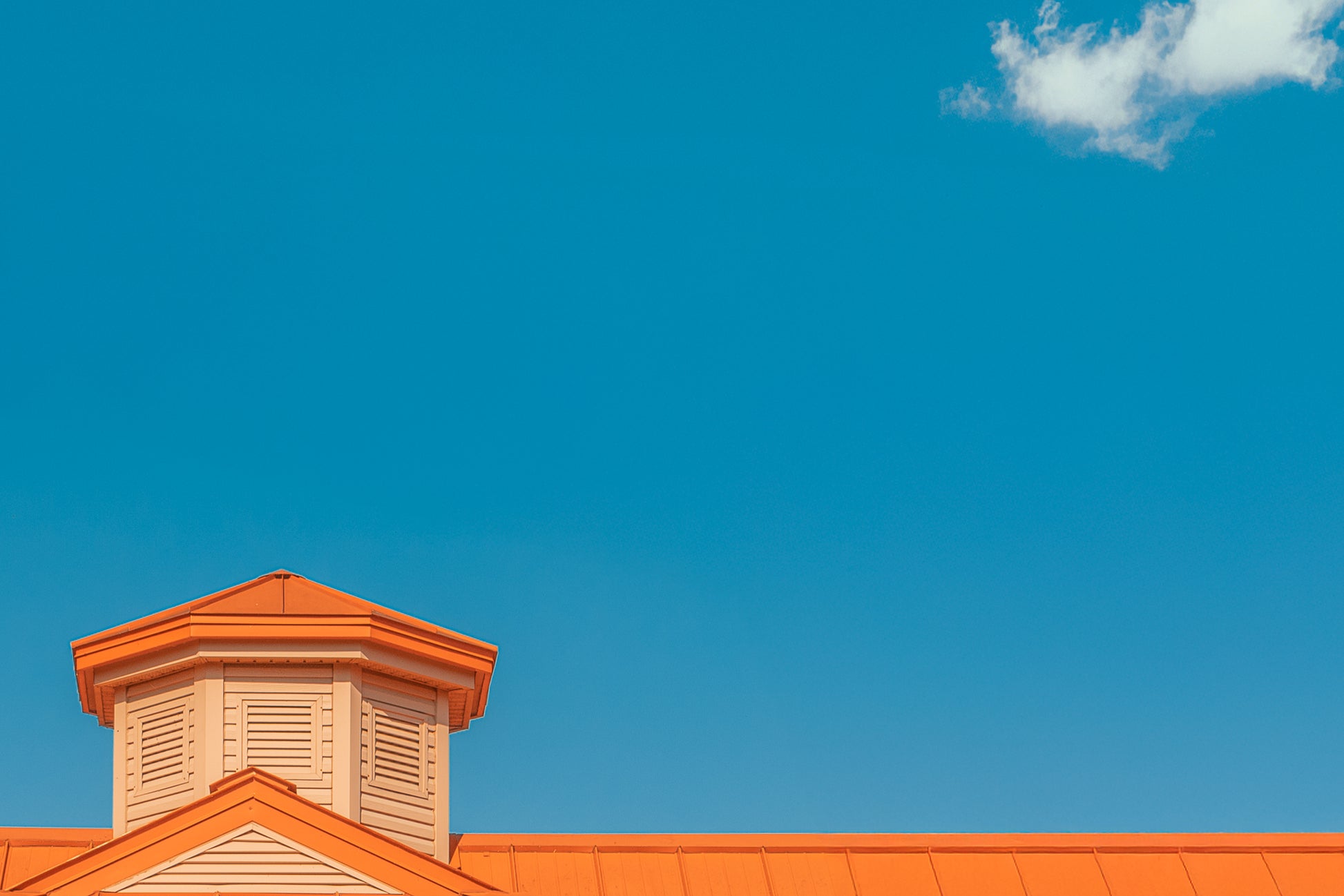 Cette photographie isole un fragment de toiture aux lignes géométriques simples, détaché sur un ciel bleu uniforme. La composition repose sur un contraste net entre la surface colorée du toit et l’étendue du ciel, réduisant l’architecture à une forme presque abstraite.