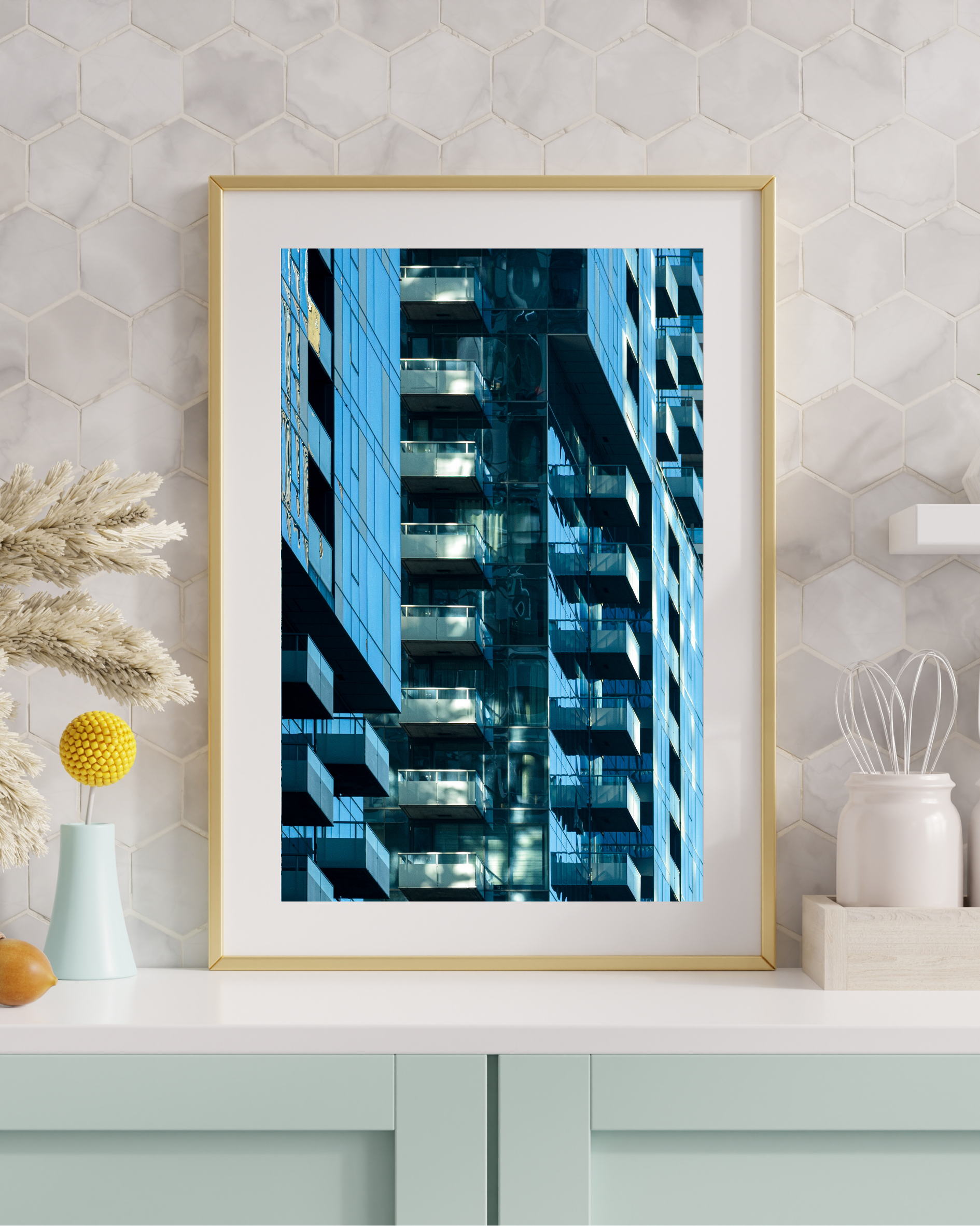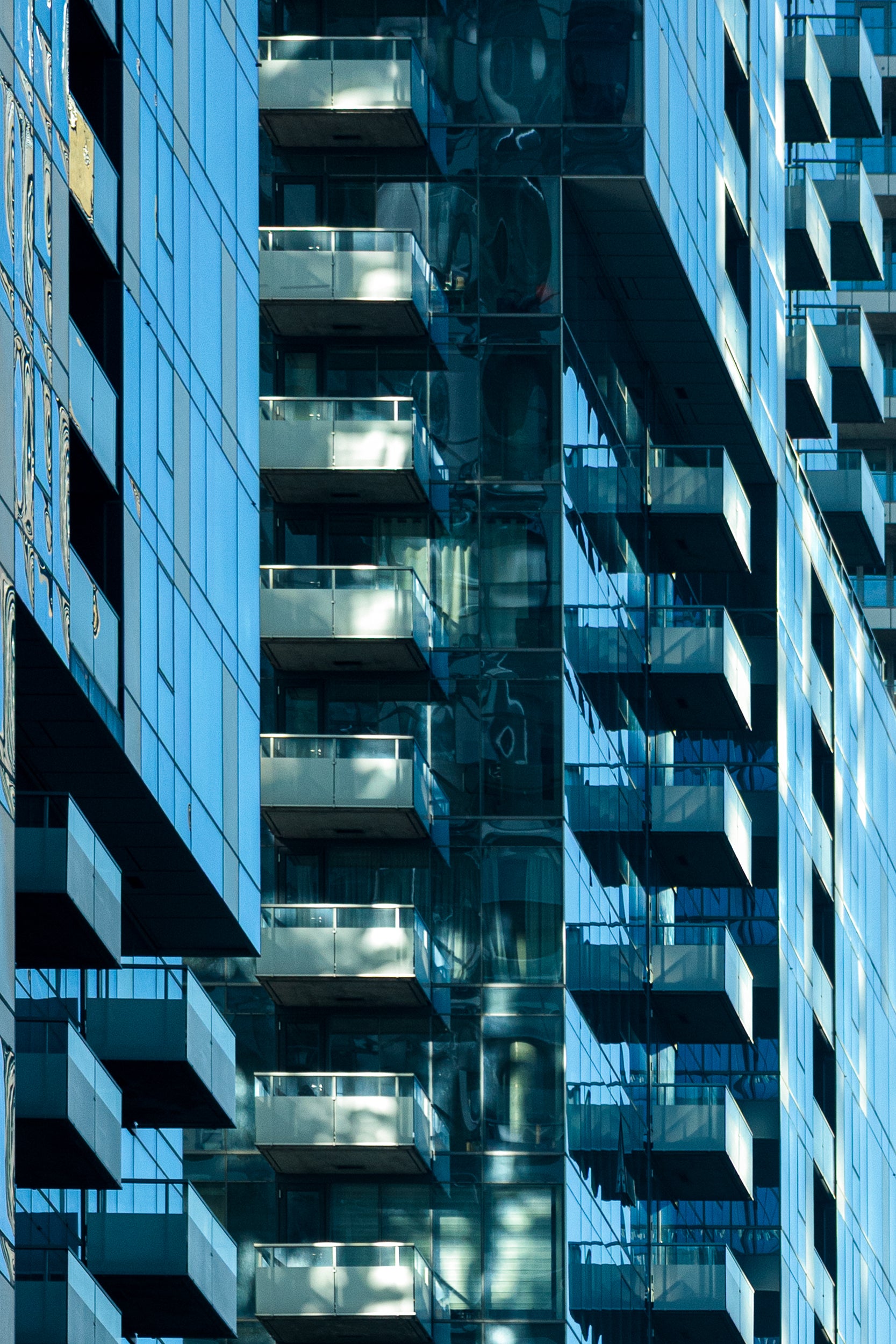 Cette photographie explore la répétition et la verticalité de l’architecture contemporaine à travers une façade rythmée de balcons et de surfaces vitrées. Les lignes se superposent, se reflètent et se dédoublent, créant une composition presque abstraite où la structure devient motif.