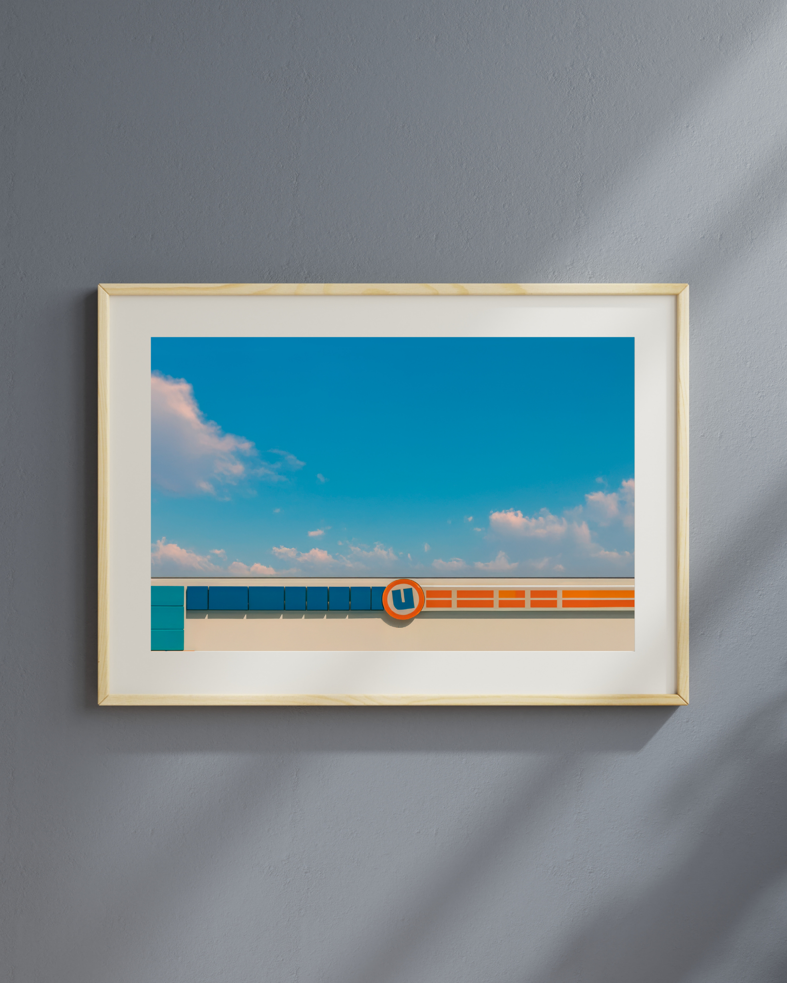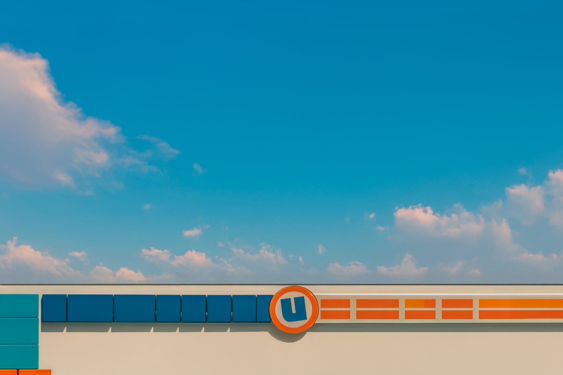 Sous un ciel limpide, la façade se déploie comme une ligne d’horizon moderne. Les couleurs franches — orange, bleu et blanc — composent une scène à la fois rétro et apaisante. L’image explore la simplicité des formes architecturales et la poésie du quotidien urbain.
