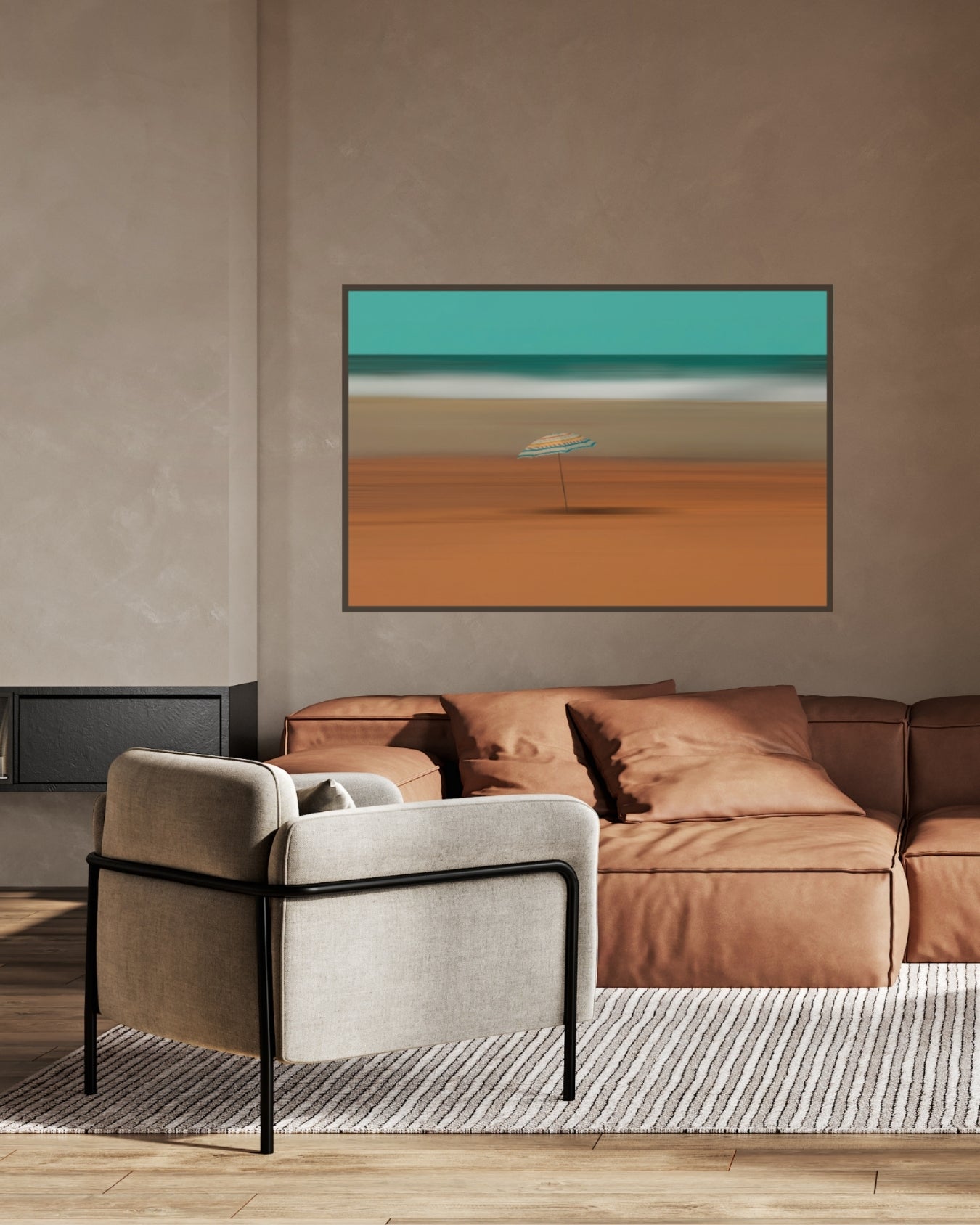 Un parasol isolé se dresse sur le sable chaud, fragile repère face à l’immensité de la mer et du ciel. Une scène minimaliste qui invite à la contemplation et à la suspension du temps.
