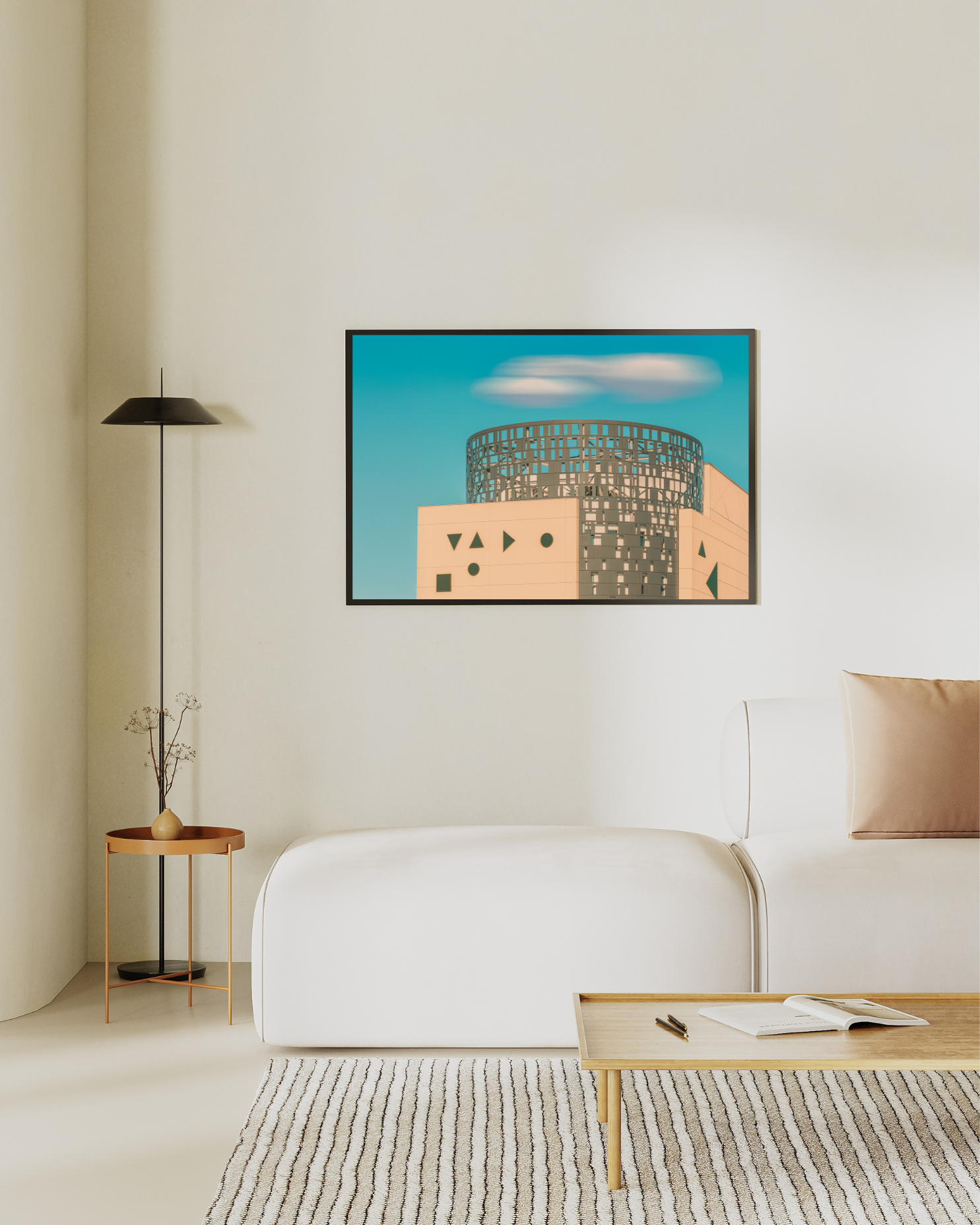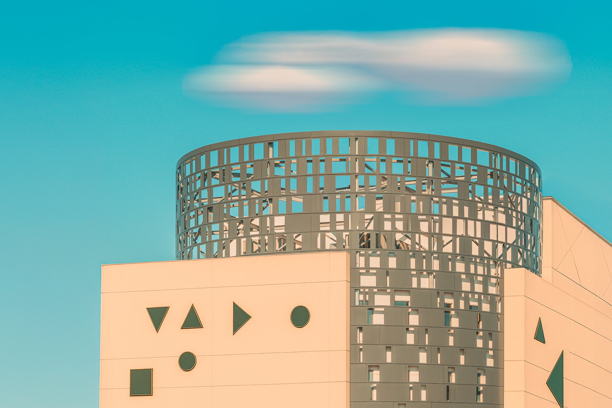 Un bâtiment à la géométrie singulière s’élève sous un ciel limpide. La façade, ponctuée de formes abstraites, dialogue avec la structure ajourée qui coiffe l’édifice — entre rigueur architecturale et poésie visuelle. L’œuvre saisit l’équilibre fragile entre matière et légèreté, ancrage et élévation.