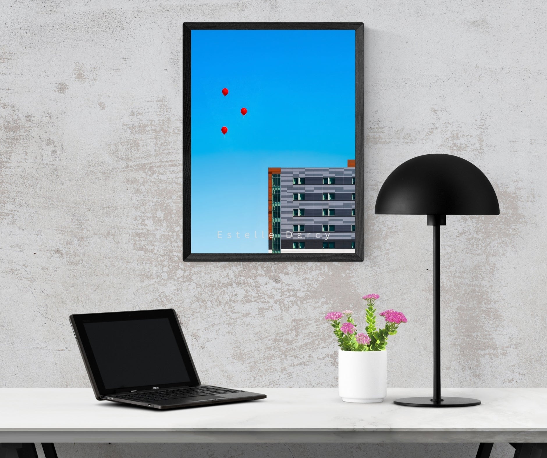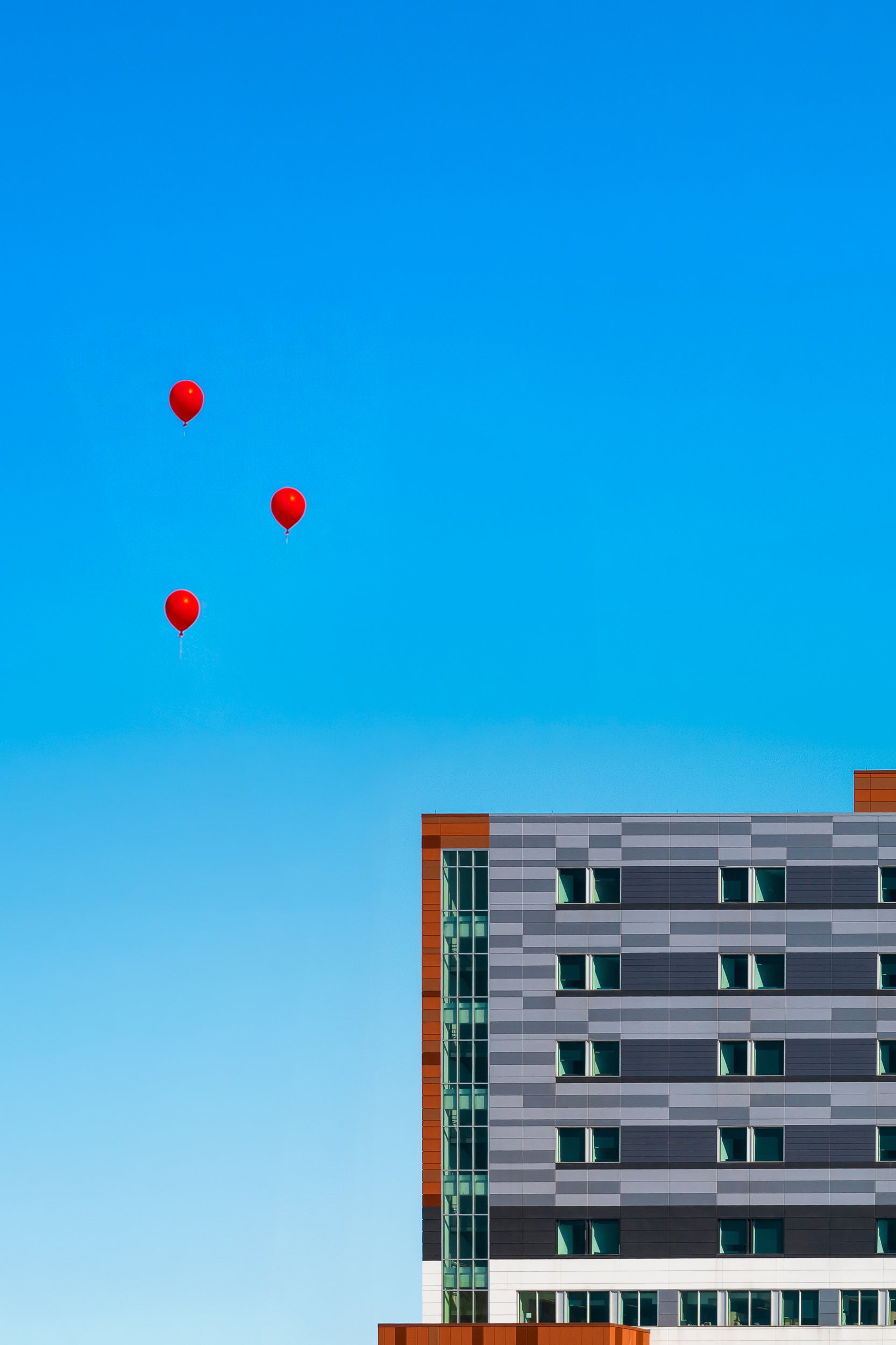 Dans cette photographie minimaliste, un fragment d’architecture urbaine apparaît au bas de la composition, laissant une large place au ciel bleu intense. Trois ballons rouges s’élèvent dans l’espace, apportant une note de légèreté et de mouvement au sein d’un paysage urbain structuré.