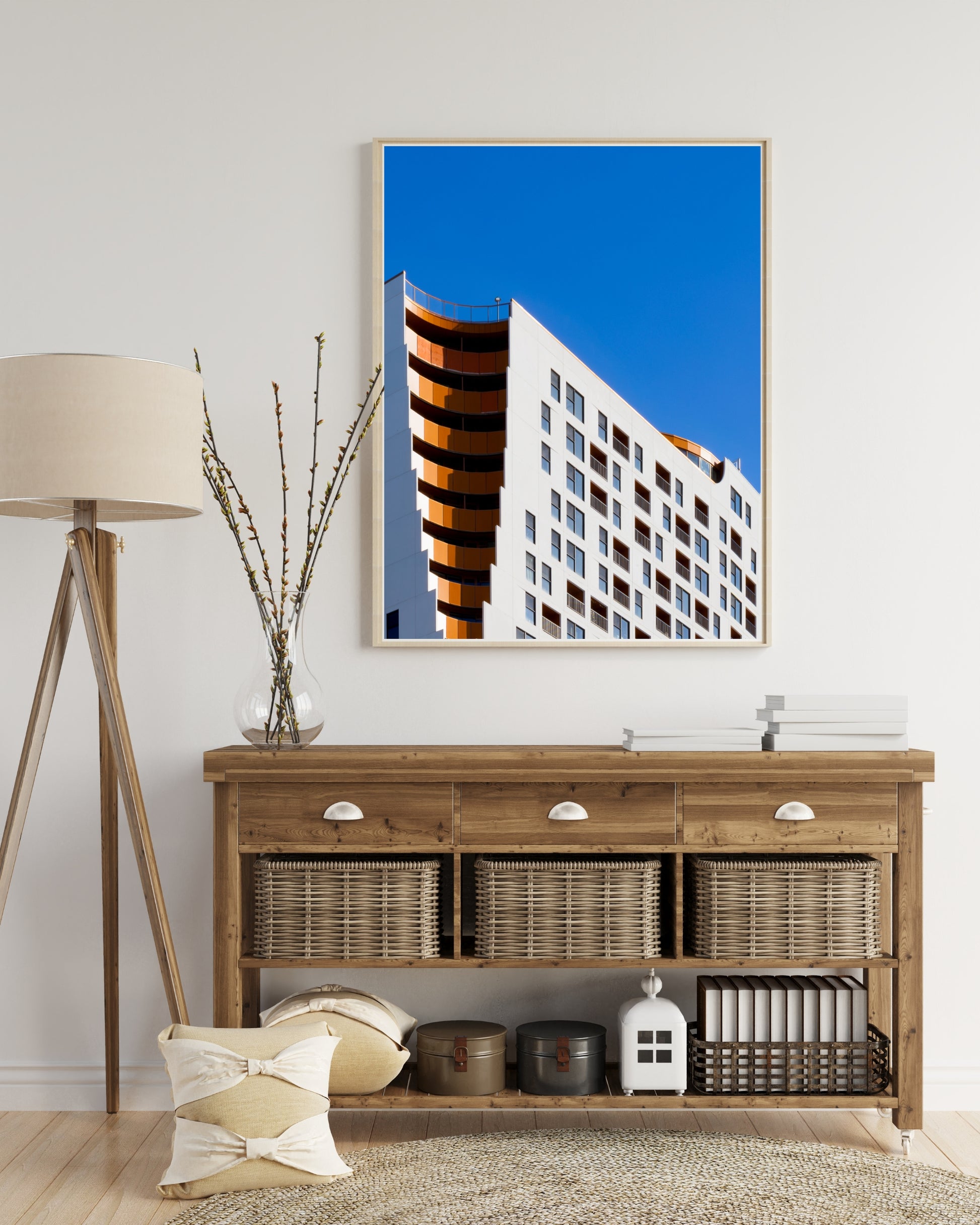 Le contraste entre la courbe et la ligne droite crée une tension visuelle subtile, renforcée par la séparation nette des volumes. Le ciel bleu uniforme agit comme un fond graphique, isolant les formes et accentuant la lisibilité des masses architecturales.