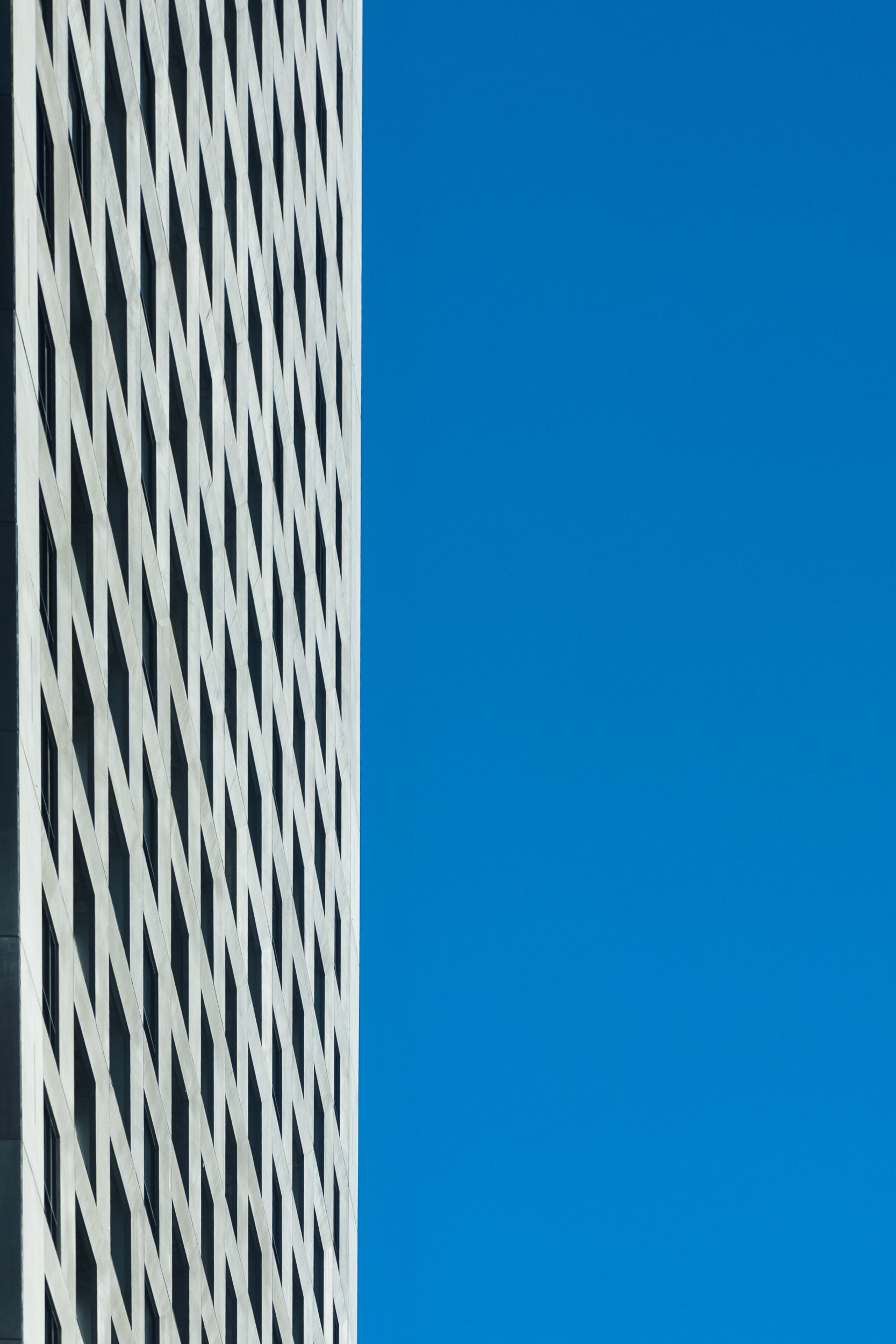 Cette photographie met en tension deux éléments architecturaux distincts : une façade texturée aux motifs répétitifs et une surface bleue uniforme occupant une large partie de la composition. La ligne de séparation, nette et verticale, structure l’image et crée un dialogue entre matière et couleur.