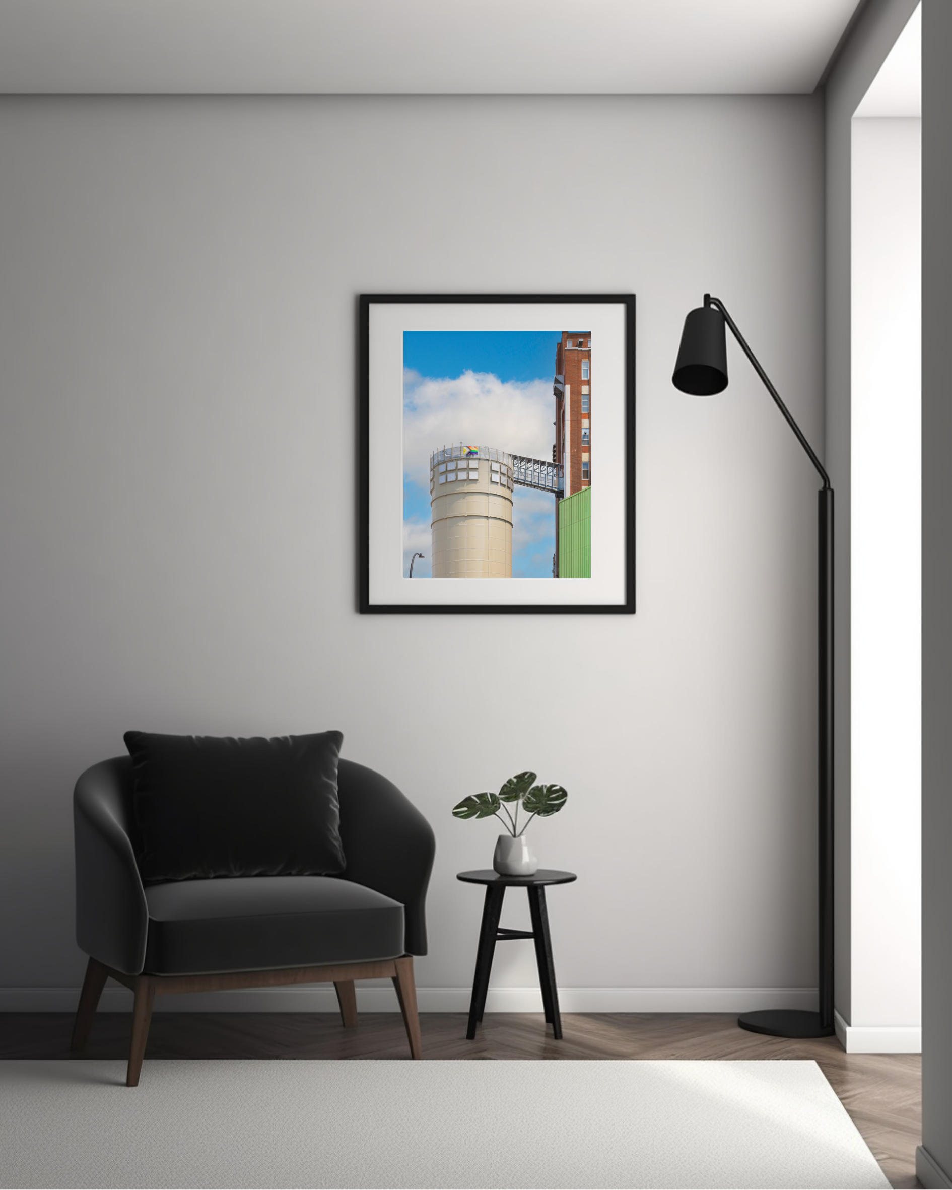 Cette photographie met en scène une architecture industrielle revisitée par la lumière et la couleur.