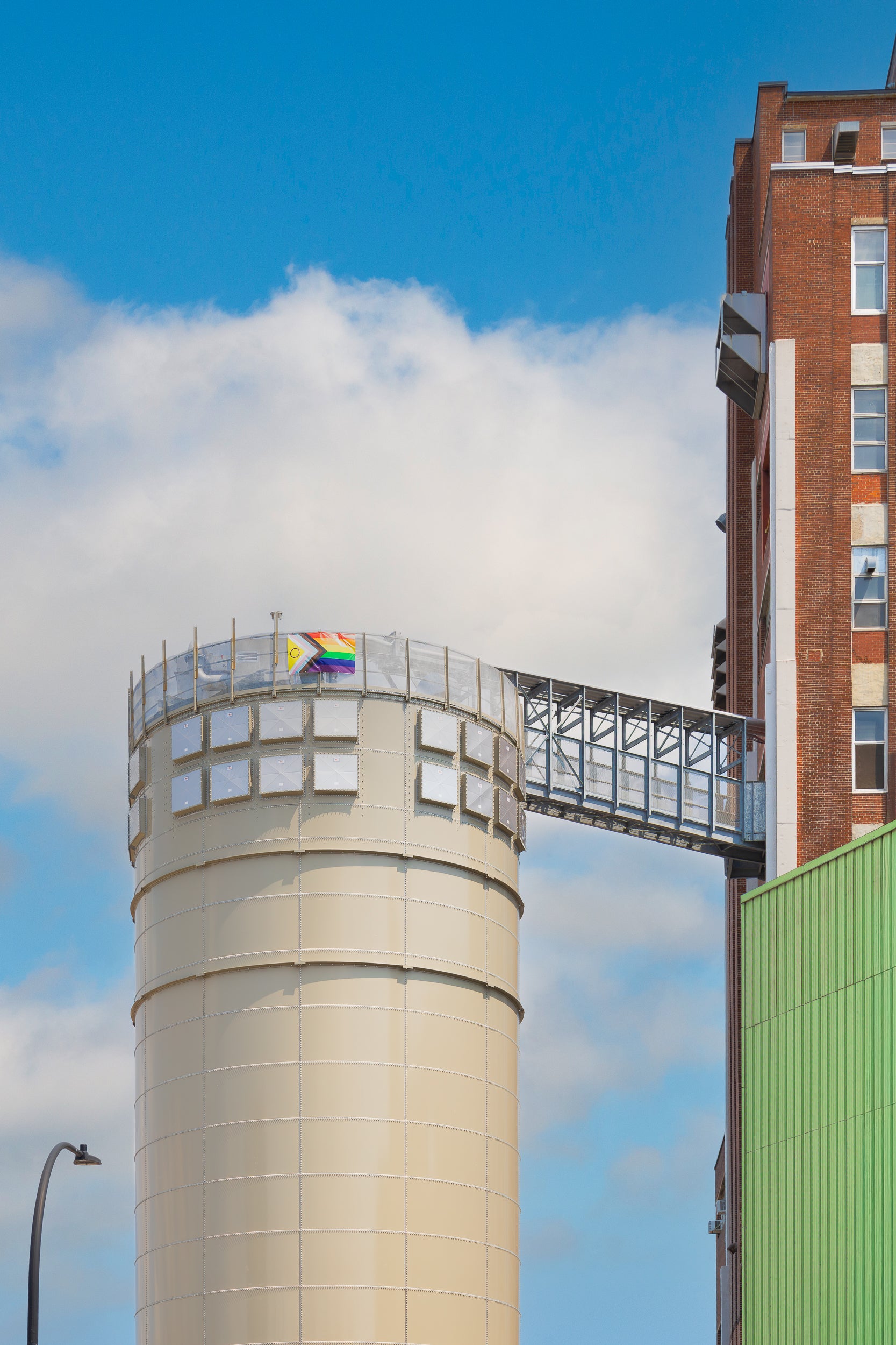 Une structure cylindrique se dresse face au ciel, reliée par une passerelle métallique à un bâtiment de brique, créant un dialogue entre courbes et lignes droites, masses pleines et transparences.