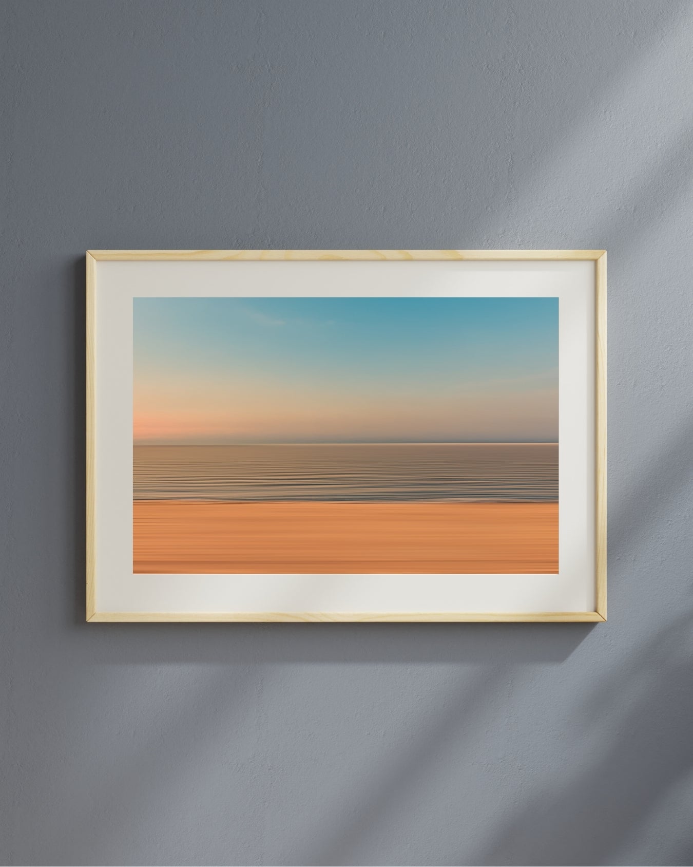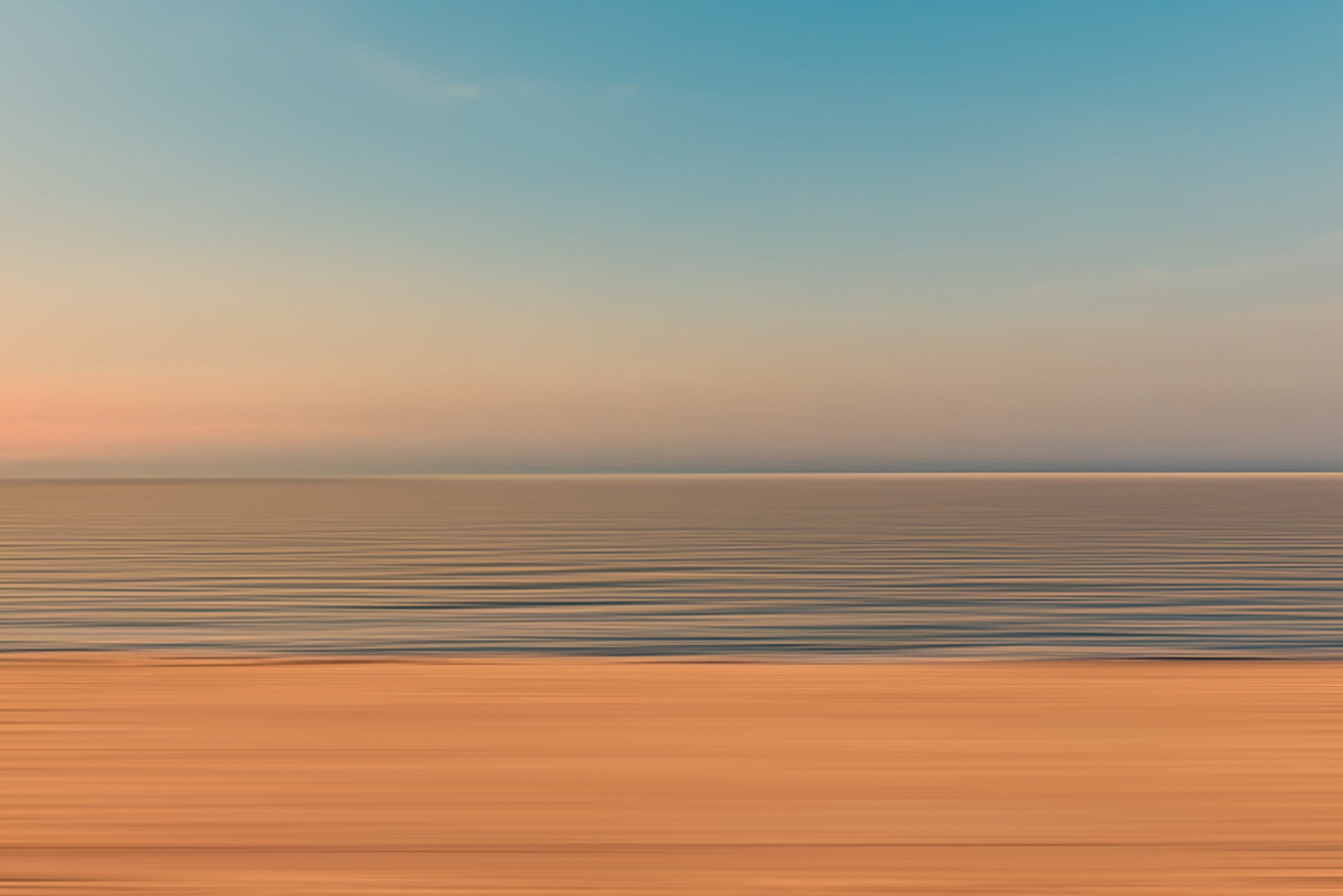 Un horizon pastel se déploie en dégradés doux, où le bleu du ciel rencontre des nuances chaudes d’ocre et d’orange.