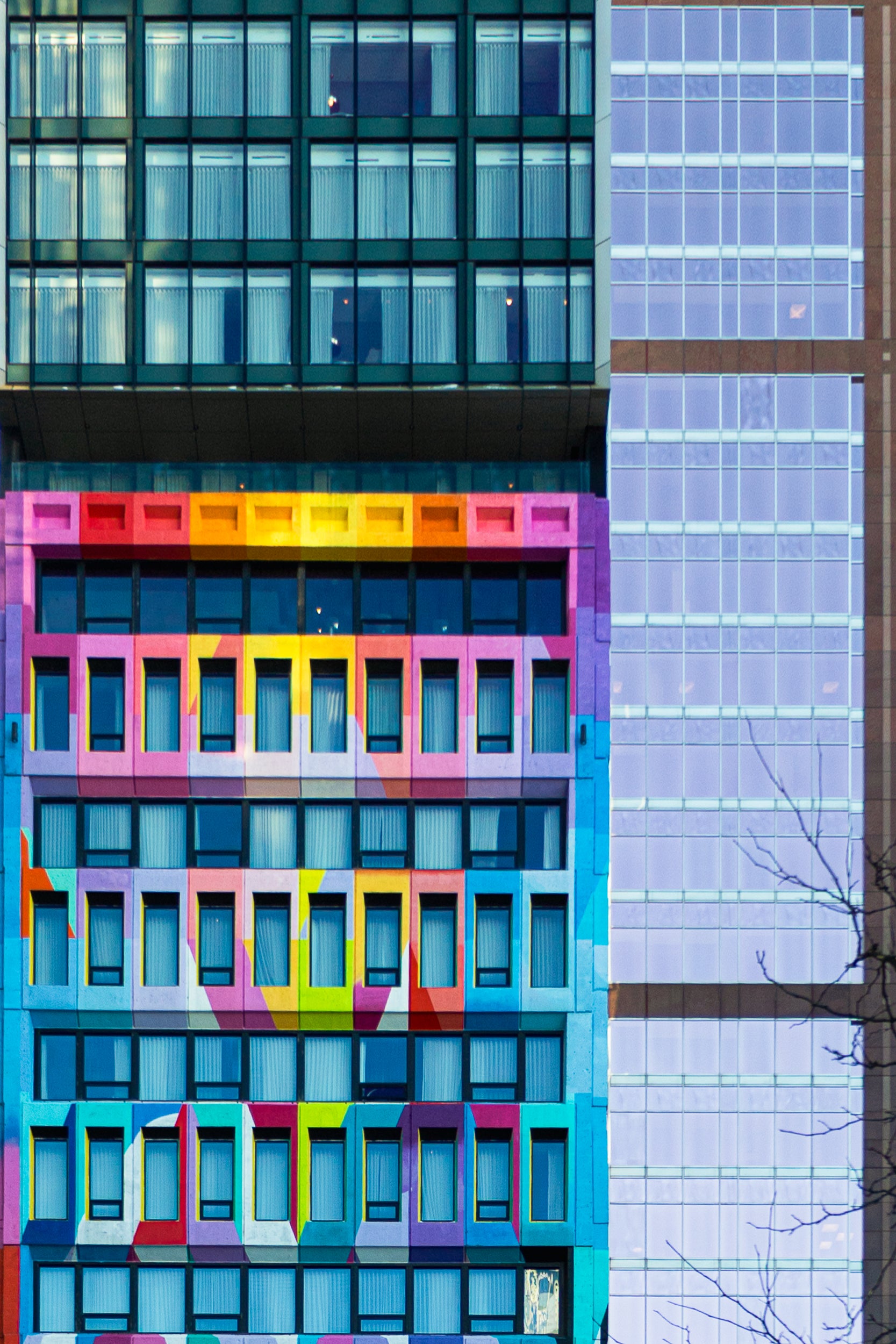 La palette chromatique, dominée par des teintes franches et contrastées, rompt avec la neutralité habituelle de l’architecture contemporaine et transforme la façade en surface expressive. Les lignes répétitives structurent l’image, tandis que la couleur introduit une dynamique presque picturale.