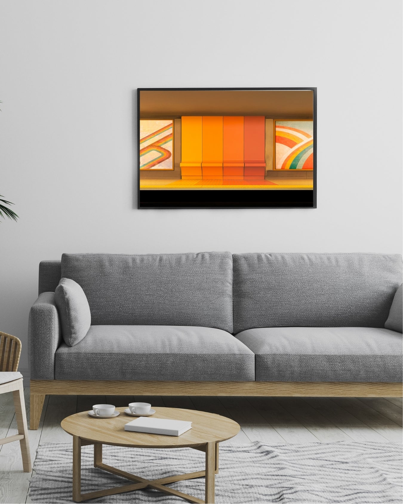 Les lignes verticales structurent l’image et instaurent un rythme visuel régulier, tandis que les motifs arrondis en arrière-plan apportent une légère dynamique graphique. Le contraste entre les surfaces planes et les éléments décoratifs crée un équilibre entre ordre et mouvement.